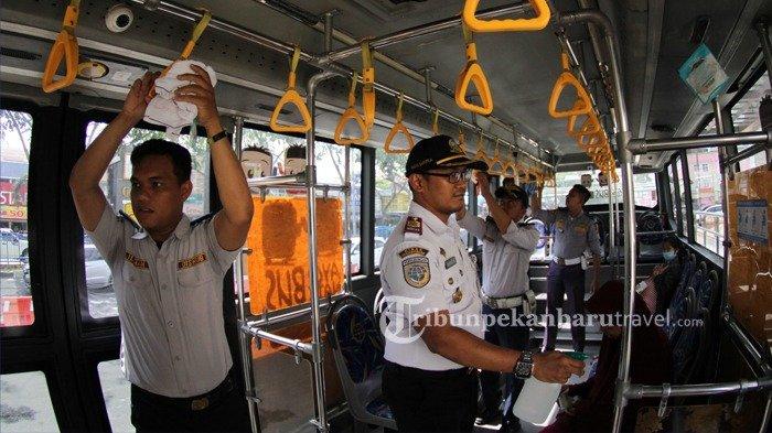 Petugas Dinas Perhubungan Kota Pekanbaru melakukan sterilisasi Bus Trans Metro Pekanbaru (TMP) dan Halte Bus TMP dalam upaya pencegahan Virus Corona