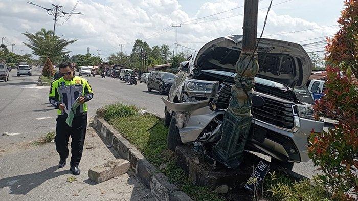 Gagal Salip Mobil, Innova Dikendarai Mahasiswa Panjat Median Jalan Tabrak Tiang Lampu di Pekanbaru